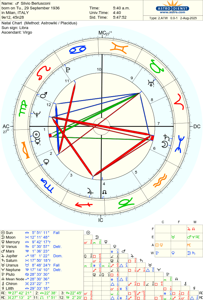 Il tema natale di Silvio Berlusconi è un esempio illuminante di come, dal punto di vista astrologico, l’individualizzazione consista tanto nella scelta di un destino quanto nell’esclusione o rinuncia ad altre possibilità. Ma cosa orienta davvero questa scelta? Ed è davvero una scelta consapevolmente desiderata? E, soprattutto, fino a che punto avrà realizzato il potenziale più autentico, la vocazione intuibile nella trama simbolica delineata nel tema?